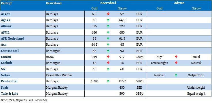 - Het koersdoel voor Ageas gaat bij Barclays van 60 naar 64,5 EUR