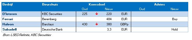 - D'Ieteren: KBC Securities verlaagt het koersdoel voor de Belgische holding actief in onder meer autoglasherstel en auto-onderdelen. Na de publicatie van de halfjaarcijfers voor 2025 heeft KBC Securities de winstverwachting licht neerwaarts bijgesteld, met een aangepaste winst vóór belastingen van 935 miljoen euro. Hoewel lagere marges bij Belron en TVH Parts worden verwacht, compenseren lagere financieringskosten en een gunstige dollarkoers dit deels. Het koersdoel wordt verlaagd van 225 naar 220 euro per aandeel, met een ‘Kopen’-aanbeveling.