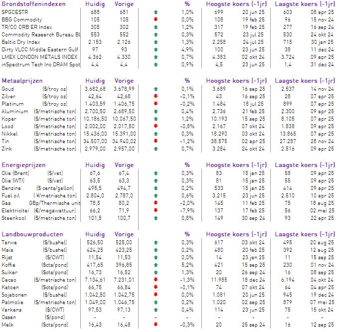 - Qua trends ondersteunden geopolitieke rust en AI-gedreven techmomentum de ondertussen lang durende rally, hoewel tariefrisico's blijven hangen. Maar over het geheel genomen blijft “voorzichtig optimisme” het credo van de dag, week en maand. En dat was vannacht zeker ook zo in Azië, dat opnieuw voor winst tekent: Zuid-Korea (+1,2%), Taiwan (+1,2%), Japan (+0,56%) en India (+0,5%) kleurden frisgroen, zodat de MSCI Asia-Pacific 0,7% aantrok tot het hoogste peil in 4 jaar.