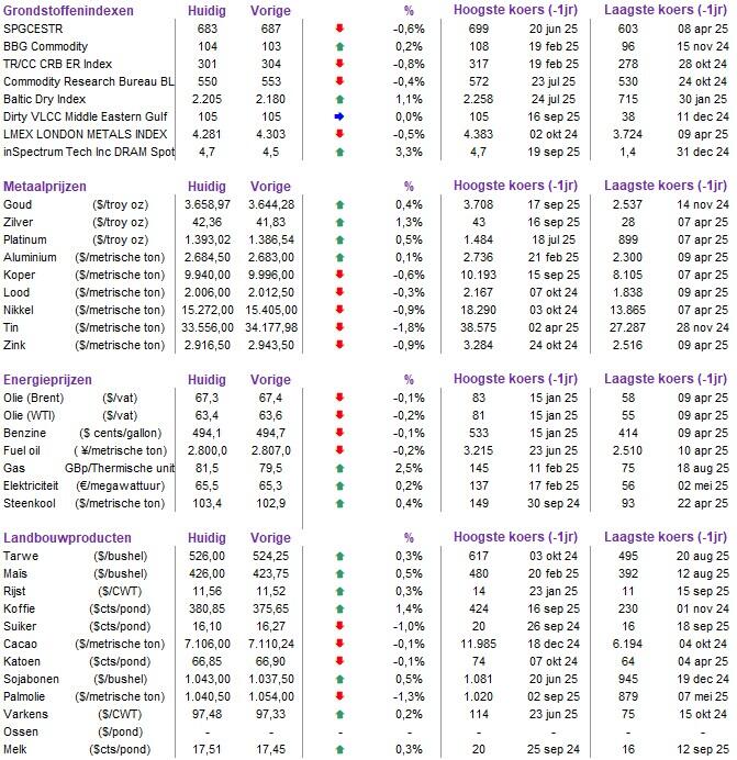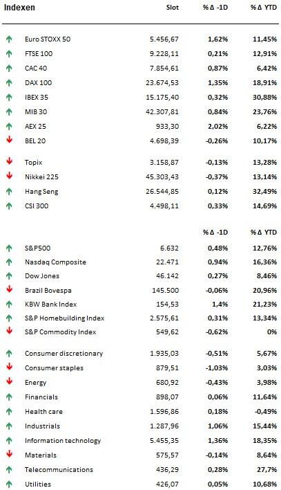 - De renteverlaging deed zijn werk, al zeker op de Europese en Amerikaanse aandelenmarkten. De sfeer zat er meer dan goed, met 0,8% winst voor de Euro Stoxx 600, terwijl de Dow Jones en S&P 500 zo’n 0,4% aandikten. De Nasdaq kreeg er 0,9% bij, terwijl de small-cap index Russell 2000 liefst 2,5% hoger schoot, en allemaal tikten de indexen af op recordhoogtes. Technologie boven, eens te meer, en small caps, met specifieke focus op de klassieke toppers in de halfgeleider- en AI-sectoren.