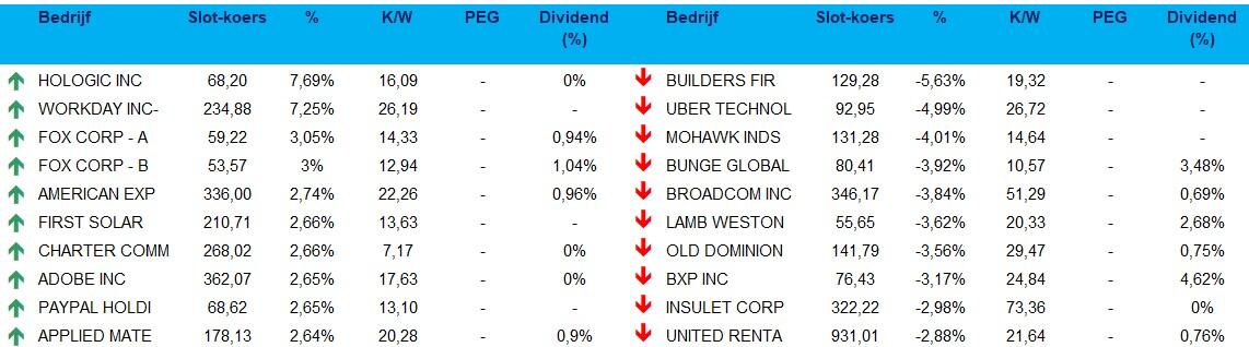 FedEx: {{263833, FEDEX CORP., FDX}} de pakketbezorger uit Memphis meldt een kwartaalwinst van 912 miljoen dollar of 3,83 dollar per aandeel, tegenover een gemiddelde analistenverwachting van 3,59 dollar. De omzet steeg tot 22,24 miljard dollar, boven de verwachte 21,66 miljard dollar, dankzij kostenbesparingen en sterke binnenlandse leveringen. Internationale volumes daalden door het wegvallen van Amerikaanse invoervrijstellingen, wat een jaarlijkse tegenwind van 1 miljard dollar betekent. FedEx herhaalde zijn winstverwachting voor boekjaar 2026 van 17,20 tot 19,00 dollar per aandeel, iets onder de gemiddelde analistenverwachting van 18,21 dollar.