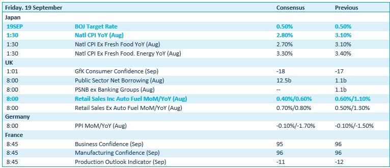 - Qua economisch nieuws vervolgt het rentecircus vandaag zijn wereldtournee, omdat de Japanse centrale bank over de beleidsrente besliste. Dichter bij huis kijken we uit naar de Britse kleinhandelsverkoop en – mogelijk belangrijker – het consumentenvertrouwen in september. Duitsland zat daar de evolutie van de producentenprijzen tegenover, terwijl Frankrijk zijn plaats op de kalender opeist met een update van het zakelijke vertrouwen in september. Geen van deze cijfers weegt echter voldoende zwaar om écht de stempel op de handelsdag te kunnen duwen.