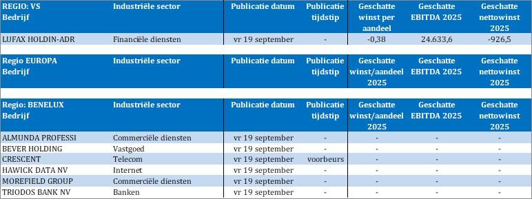 - Bedrijfsresultaten komen er onder meer van de Lufax Holding, Almunda Professional, Bever Holding, Crescent, Hawick Data, Morefield en de Triodos Bank.