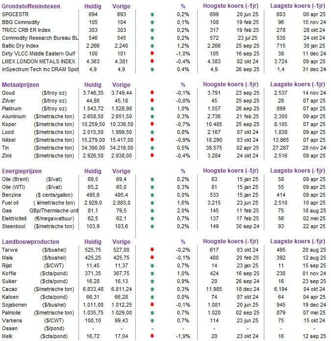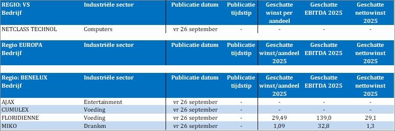 Volkswagen: {{176160, VOLKSWAGEN AG, VOW}} de Duitse autofabrikant verlaagt de productievolumes en voert tijdelijke stilleggingen door in zijn elektrische-voertuigenfabrieken in Zwickau en Emden wegens zwakke vraag, vooral voor de Audi Q4 e-tron. De fabriek in Zwickau stopt een week lang vanaf 6 oktober, terwijl in Emden de werktijden zijn ingekort en productielijnen tijdelijk worden stilgelegd. Vorige week kondigde Volkswagen al een verlies van 5,1 miljard euro aan door de vertraagde uitrol van elektrische modellen bij Porsche AG. De dalende vraag, toenemende concurrentie uit China en hogere Amerikaanse invoertarieven zetten de groep onder druk.