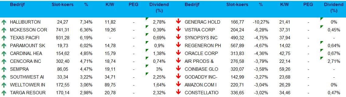 Costco: {{72721, COSTCO WHOLESALE CORP., COST}} de ledenwinkelketen overtrof in het vierde kwartaal de omzet- en winstverwachtingen dankzij consumenten die op zoek zijn naar voordelige basisproducten. De omzet bedroeg 86,16 miljard dollar, tegenover een gemiddelde analistenverwachting van 86,06 miljard dollar. De winst per aandeel kwam uit op 5,87 dollar, boven de gemiddelde analistenverwachting van 5,80 dollar. Hogere inkomsten uit lidmaatschapsgelden en scherpe prijzen voor huismerken droegen bij aan het resultaat.