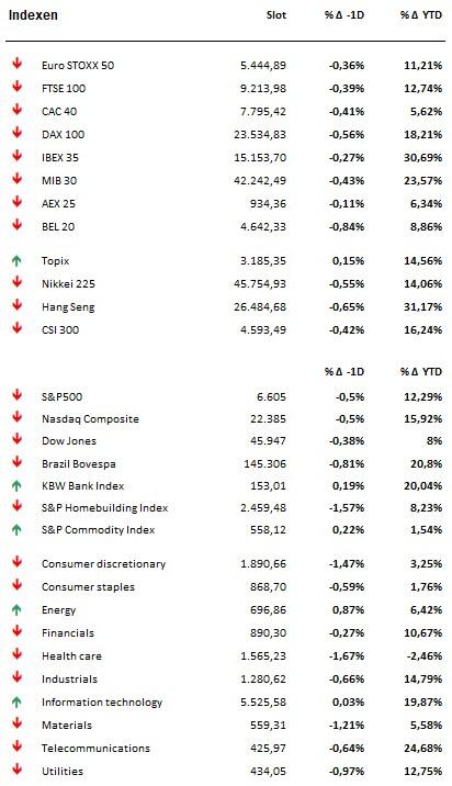 - Langzaam maar zeker waart het Marco Borsato-spook weer prominenter overheen de aandelenmarkten. Dat resulteerde gisteren in een duidelijk verlies voor de Europese aandelen. De Euro Stoxx 600 ging 0,7% lager, onder druk van de gezondheidssector (-1,9%). Het Duitse Siemens Healthineers verloor 4,3%, het Deense Coloplast 3,4% en Noorderbuur Philips 3%, nadat het Amerikaanse ministerie van Handel nieuwe veiligheidsonderzoeken opende naar de import van persoonlijke beschermingsmiddelen, medische artikelen, robotica en industriële machines. Maar ook de bouw en materialensector ging stevig in de min (-1,2%), net zoals de industriële goederen en diensten (-0,6%).