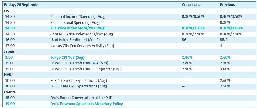 - Het is vandaag nog eens een quasi zuivere inflatiedag. De Amerikaanse PCE prijsindex staat met grote stip aangevinkt, en daar horen natuurlijk verwachtingen bij: de levensduurte volgens de favoriete graadmeter van de Fed kan 2,7% aangedikt zijn op jaarbasis. Ek cijfer dat afwijkt zal door de obligatiemarkten vertaald worden in een bijstelling van de renteverwachtingen. Verder levert de VS een inzicht in de persoonlijke inkomens en een van de sentimentsindex van de universiteit van Michigan en de Federal Reserve bank van Kansas aan.