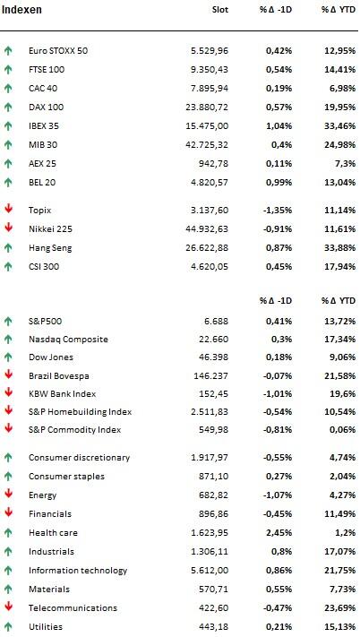 - In Europa daalden de aandelenkoersen licht. De STOXX 600 daalde licht, mede onder invloed van energiebedrijven als gevolg van de zwakke olieprijzen en aanhoudend pessimisme over de wereldwijde vraag. De toon was eerder voorzichtig dan paniekerig. De markten leken de sluiting van de overheid te beschouwen als een bekend risico in plaats van een onvoorziene schok.