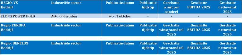 Aperam: {{42677400, APERAM SA, APAM}} de Luxemburgse fabrikant van roestvast staal heeft woensdag voorafgaand aan de stille periode zijn vooruitzichten voor het derde kwartaal herhaald. Het bedrijf verwacht een lagere bedrijfskasstroom (EBITDA) dan in het tweede kwartaal, waarin deze 112 miljoen euro bedroeg; de gemiddelde analistenverwachting voor het derde kwartaal ligt op 77 miljoen euro. Aperam ziet een stabiele markt in Brazilië, maar aanhoudende prijsdruk in Europa, en merkt op dat de orderportefeuille geen herstel vertoont in 2025. Wel ligt het bedrijf nog steeds op schema om de beoogde kostenbesparingen van 75 miljoen euro te realiseren.