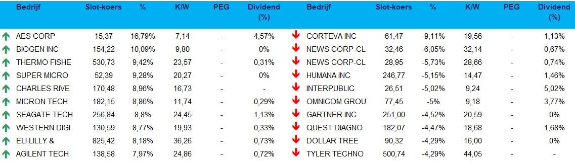 - Daarnaast leverde ook het tech-/chipsegment een bijdrage: Micron steeg met ~9 %, waardoor de Philadelphia-chipindex omhoog ging. Nutsbedrijven presteerden uitstekend: AES steeg met ~17 % door overnamegeruchten (BlackRock's Global Infrastructure Partners zou interesse hebben) en hielp daarmee de nutssector omhoog. Aan de zwakkere kant presteerden grondstoffen ondermaats, onder druk van cyclische factoren en rotatie uit industriële en grondstoffenaandelen.