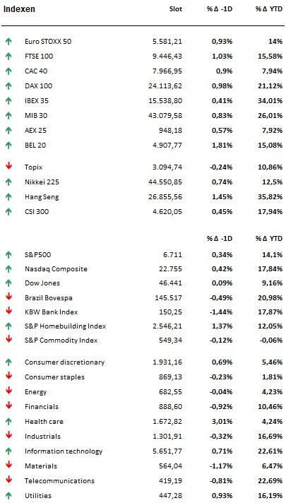 - De aandelenmarkten openden gisteren gemengd, terwijl ze de gevolgen van de nu actieve sluiting van de Amerikaanse federale overheid verwerkten. De klok sloeg middernacht zonder dat er een financieringsakkoord was bereikt, wat onmiddellijk onzekerheid veroorzaakte over de stroom van economische gegevens en de duidelijkheid van het beleid. Desondanks bleef het sentiment op peil: de S&P 500 steeg met ongeveer 0,34 %, de Nasdaq won ongeveer 0,42 % en de Dow klom met ~0,09 %. Aziatische aandelen bereikten 's nachts nieuwe records, ondersteund door de technologiesector.