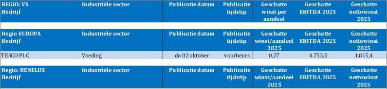 Tesla: {{37295290, TESLA INC., TSLA}} de fabrikant van elektrische voertuigen uit Californië beleefde zijn sterkste kwartaal van het jaar dankzij een Amerikaanse koopgolf voorafgaand aan het aflopen van een belastingvoordeel van 7.500 dollar. Analisten verwachten dat dit effect tijdelijk is en dat de zwakte in Europa aanhoudt. De kwartaalleveringen worden geschat op 441.500 voertuigen, ongeveer 6% minder dan dezelfde periode vorig jaar, terwijl de prognose voor heel 2025 op 1,6 miljoen ligt, zo’n 10% lager dan vorig jaar. De focus verschuift naar zelfrijdende technologie en robots, maar voorlopig komt de omzet vooral uit autoverkoop.