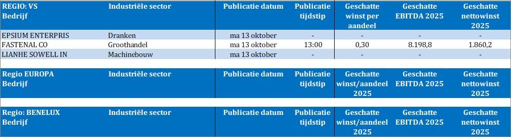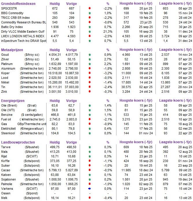 - Op Wall Street werden winsten in de technologiesector in sneltempo vastgeklikt, wat de S&P 500 technologie-subindex 4% lager duwde en 6% van de overkoepelende index van halfgeleiders afschaafde. Verder ook verliezen voor Chinese bedrijven zoals Alibaba Group (-8,4%) en JD.com (-6,2%). En die dalingen zetten zich vannacht door in Azië, waar de aandelen ook naar dekking zochten. Beijing verdedigde zondag zijn beperkingen op de export van zeldzame aardelementen, maar stopte gelijk wél met het opleggen van nieuwe heffingen op Amerikaanse producten. Sommige grote beurshuizen mikken er nu op dat er wel degelijk een oplossing uit de bus zal komen via een verlenging van de huidige tariefpauze tot na 10 november, inclusief “beperkte concessies van beide kanten'.