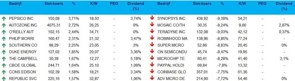 Qualcomm: {{281509, QUALCOMM INC., QCOM}} de producent van halfgeleiders heeft toegegeven dat het bij de overname van het Israëlische Autotalks in juni geen melding heeft gemaakt bij de Chinese autoriteiten. De Chinese markttoezichthouder stelt dat Qualcomm in maart op de hoogte werd gebracht dat de deal goedkeuring vereiste, maar dat het bedrijf de overname toch heeft afgerond zonder verdere communicatie. Twee dagen na deze onthulling startte China een mededingingsonderzoek naar mogelijke schending van de antitrustwetgeving. De koersdaling van het aandeel volgde op spanningen tussen de Verenigde Staten en China, nadat president Trump dreigde met nieuwe importheffingen.
