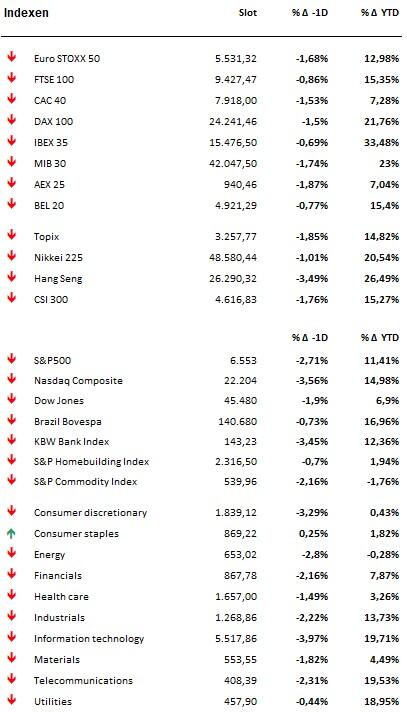 - De Europese aandelen wisselden vrijdag pas laat een redelijk ongeïnspireerde dag in een baaldag, nadat nieuwe dreigementen van president Trump de beleggerszenuwen nog eens op scherp zetten. Net nu we zo ongeveer van de meeste handelsspanningen van af leken te zijn, werd de meeting tussen de VS en China van binnen twee weken afgezegd, in ruil voor een agressief dreigement met een “enorme verhoging” (mees: 100%) van de importtarieven op Chinese goederen en het opleggen van exportcontroles op “alle kritieke software”. Dat volgt op de Chinese acties omtrent de verstrenging van de export van zeldzame aardelementen en apparatuur.