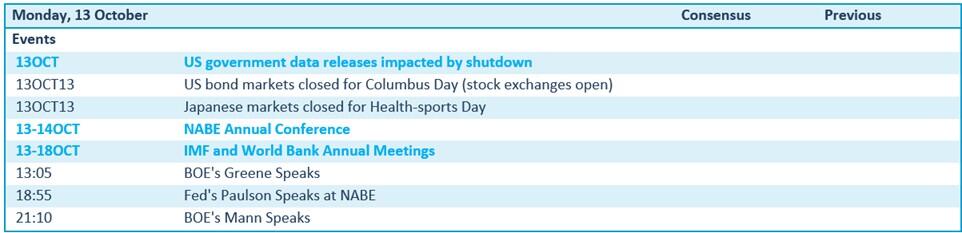 - Op de economische kalender valt weinig informatie te vinden, onder meer omdat de Amerikaanse data door de shutdown niet worden vrijgegeven. Verder is het ook Columbus Day, waardoor de obligatiemarkten het slot op de grendel houden. Ook Japan heeft een dagje vakantie voor Health Sports Day, maar gelukkig redt het IMF de meubelen met een World Bank annual meeting.