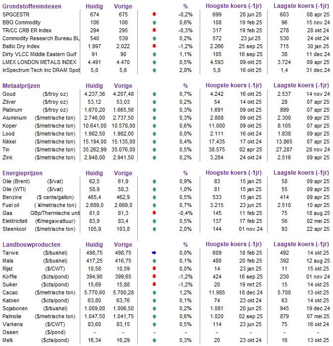 SIPEF: {{29212, SIPEF SA, SIP}} de Belgische agro-industriële groep meldt voor het derde kwartaal van 2025 een productie van 117.565 ton ruwe palmolie (CPO), een stijging van 28,1% ten opzichte van dezelfde periode vorig jaar, dankzij hogere volumes verse vruchtentrossen en verbeterde olie-extractie in Indonesië en Papoea-Nieuw-Guinea. De groep verkocht 84% van haar geplande palmolievolumes tegen een gemiddelde ex-mill prijs van 961 dollar per ton, wat resulteerde in een verkoopprijs die 12,5% hoger lag dan in de eerste negen maanden van 2024. Voor het volledige jaar verwacht SIPEF een productie van ongeveer 430.000 ton palmolie en een groepsresultaat tussen 115 en 125 miljoen dollar, terwijl het investeringsprogramma van 100 miljoen dollar op koers ligt en de netto financiële positie positief blijft. KBC Securities hanteert een koersdoel van 88 euro en geeft een ‘Kopen’-aanbeveling.