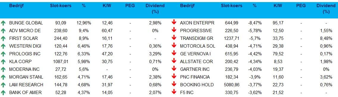 Progressive: {{1553159, PROGRESSIVE CORP., PGR}} het aandeel van de verzekeraar daalde sterk na het rapporteren van teleurstellende resultaten. Progressive verdiende 4,45 dollar per aandeel op een omzet van 21,38 miljard dollar, wat lager was dan de 5,04 dollar per aandeel die analisten hadden verwacht. Ook de omzet bleef achter bij de geschatte 21,82 miljard dollar . Een factor die de prestaties beïnvloedde was een beleidswijziging in Florida die de winst van verzekeraars beperkt. Als gevolg van deze resultaten daalden ook andere verzekeringsaandelen: Allstate bijna 5%, Chubb 2% en Travelers bijna 3%.