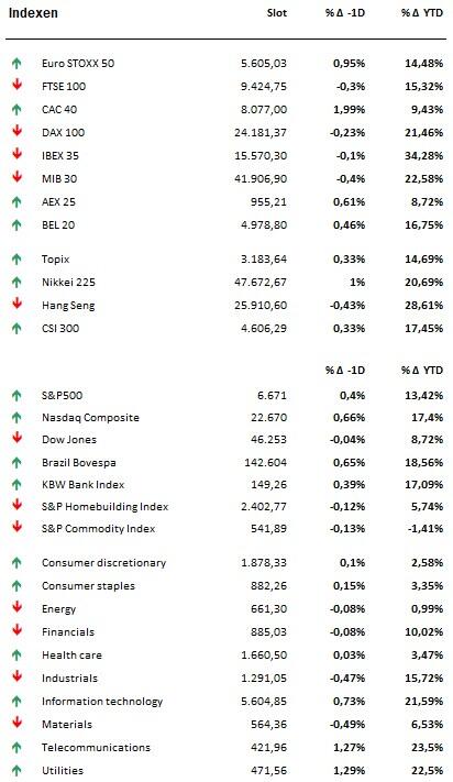 Morgan Stanley: {{274646, MORGAN STANLEY, MS}} de Amerikaanse zakenbank heeft in het derde kwartaal de verwachtingen ruimschoots overtroffen dankzij een sterke stijging van de inkomsten uit fusies en overnames, wat leidde tot een recordomzet van 18,2 miljard dollar. De aangepaste winst per aandeel bedroeg 2,80 dollar, tegenover een gemiddelde analistenverwachting van 2,10 dollar. De bank zag ook sterke groei in aandelenhandel (+35%), vermogensbeheer (+13%) en equity underwriting (+80%), en verwacht dat het volume aan deals in 2025 mogelijk het recordjaar 2021 zal overtreffen.