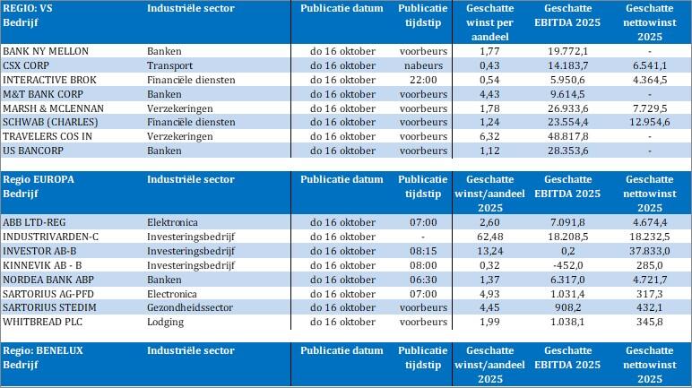 - Bedrijfsresultaten komen er vandaag van Bank NY Mellon, CSX, Interactive Brokers, M&T Bank, Marsh & McLennan, Charles Schwab, Travelers Cos, US Bancorp, ABB, Industrivarden, Investor, Kinnevik, Nordea Bank, Sartorius, Sartorius Stedim en Whitbread.
