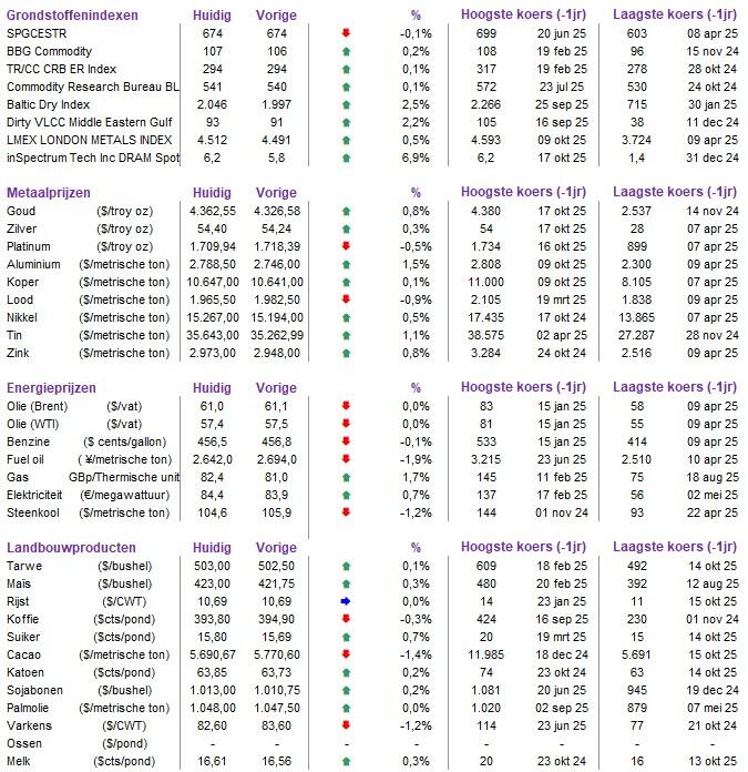 - China beschuldigde de VS er donderdag van paniek te zaaien over zijn controles op zeldzame aardmetalen en wees een oproep van het Witte Huis om de beperkingen terug te schroeven van de hand. En dat zint beleggers niet, dan fluks een hernieuwde vlucht naar veiligheid inzetten, wat de goudprijs zoals gezegd andermaal ondersteunde en ook de zilverprijs een nieuwe piek bereikte. Ook de Aziatische banken hadden opvallend veel last van tekenen van appelflauwte, ook omdat de banken plots wat kritischer bekeken worden.