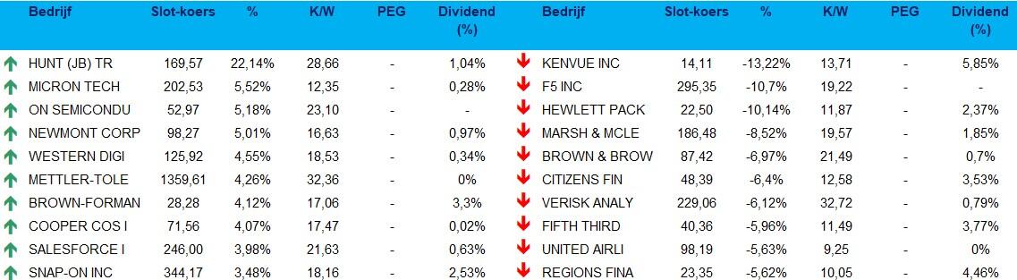 Hewlett Packard Enterprise: {{146221202, HEWLETT PACKARD ENTERPRISE CO., HPE}} de fabrikant van servers en supercomputers daalde sterk na tegenvallende vooruitzichten voor het boekjaar dat eindigt op 31 oktober 2026. HPE zei dat de aangepaste winst per aandeel tussen 2,20 en 2,40 dollar zou liggen, vergeleken met de gemiddelde analistenverwachtingen van 2,40 dollar . HPE verwacht een omzetgroei tussen 5% en 10%, terwijl analisten 17% hadden voorzien.