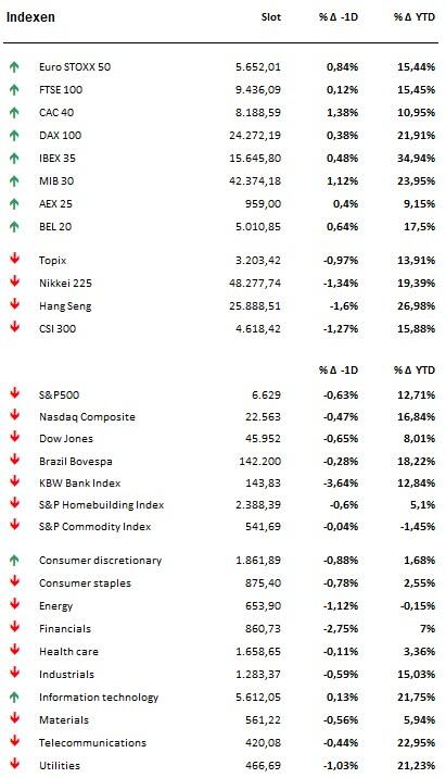 - Wall Street opende eveneens positief, maar gleed doorheen de dag wel af naar 0,6% verlies voor de S&P500 en 0,5% voor de Nasdaq. Eén van de nieuwe elementen in het verhaal is dat er meer en meer tekenen zijn van kredietstress bij regionale Amerikaanse banken in de VS.