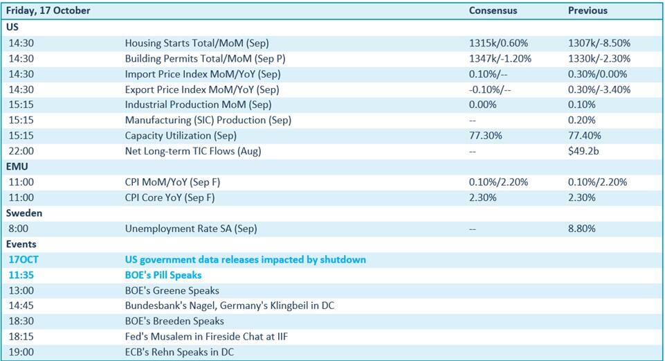 - Op de economische kalender is het ook vandaag weer blind vliegen, tenminste in de VS. De shutdown verhinderd de opmaak en de publicatie van data. Enfin, we zullen wel zien welke cijfers er eventueel door komen. Wel zeker is dat er finale Europese inflatiecijfers aankomen, die naar schatting een stijging met 2,2% op jaarbasis kunnen uitwijzen. Verder geeft Zweden inzicht in de werkloosheidsgraad, terwijl onder meer Bank of England topman Huw Pill een speech mag afsteken.