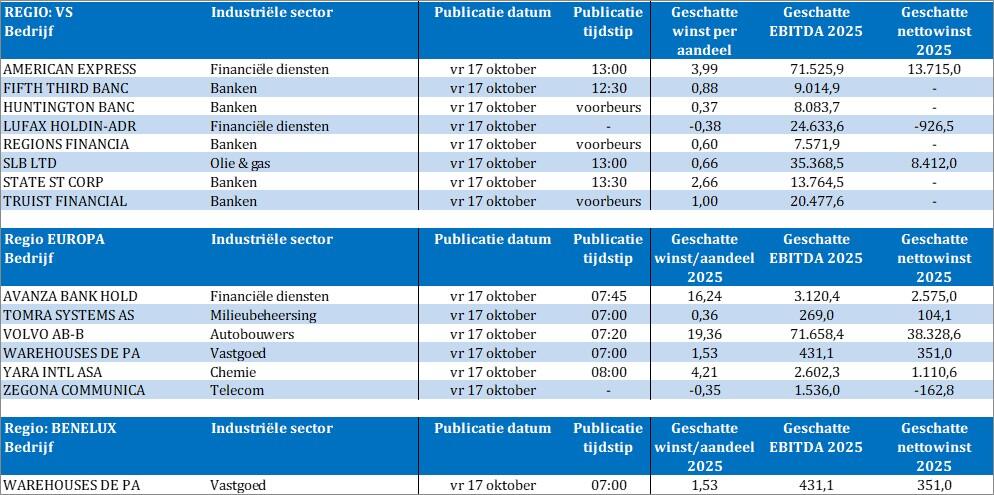 - Bedrijfsresultaten krijgen we vandaag onder meer van American Express, Fifth Third Bancorp, Huntington Banc, LufaxHolding, Regions Financial, SLB, State Street, Truist Financial, Avanza Bank, Tomra Systems, Volvo, WDP, Yara en Zegona Communications.