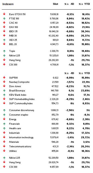 Caixabank: {{19641606, CAIXABANK SA, CABK}}de Spaanse bank zag in het derde kwartaal de rente-inkomsten met 4,3% dalen tot 2,67 miljard euro door lagere rentetarieven, al was er een lichte verbetering ten opzichte van het vorige kwartaal dankzij lagere depositokosten en hogere kredietvolumes. De nettowinst daalde met 8% tot 1,45 miljard euro, mede door een belastinglast van circa 150 miljoen euro. Caixabank kondigde een nieuw aandeleninkoopprogramma aan ter waarde van 500 miljoen euro en verhoogde de doelstelling voor het rendement op eigen vermogen (ROTE) tot circa 17% voor 2025. De bank keert in november een interim-dividend uit van 16,79 cent per aandeel, goed voor 1,18 miljard euro.