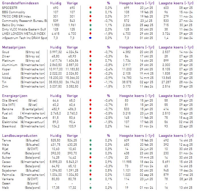De goudprijs blijft flirten met de grens van $4.000 dollar per ounce, terwijl de Bitcoin even richting 106.500 dollar dook, om alsnog te herstellen tot 109.537 dollar. De prijs voor een Brent-olie daalde 0,3% naar 63,91 dollar per vat omdat ruime Amerikaanse voorraden de OPEC+-productieverminderingen compenseerden.