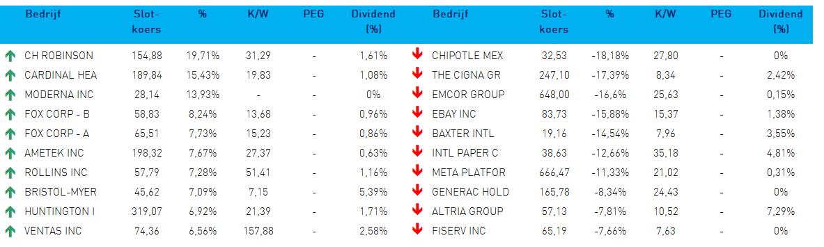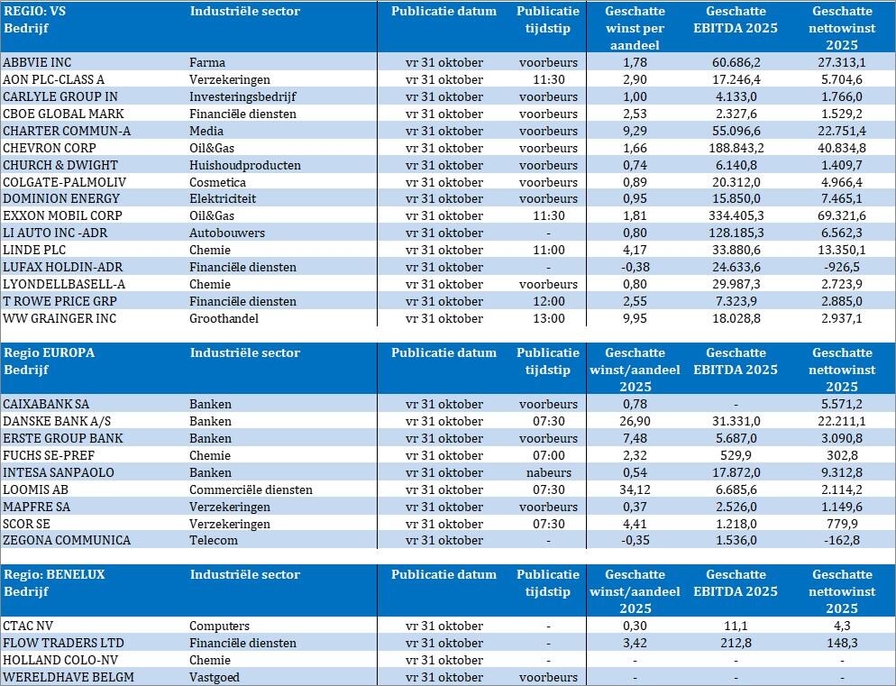 Bedrijfsresultaten komen er onder meer van Abbvie, Aon, Carlyle, CBOE Global Markets, Chevron, Colgate Palmolive, Dominion Energy, Exxon Mobil, Li Auto, Linde, Lyondell basell, T Rowe Price, Caixa bank, Danske Bank, Erste Bank, Fuchs, Intensa San Paolo, Scor, CTAC, Flow Traders, Holland Colours, Wereldhave Belgium en Fugro.