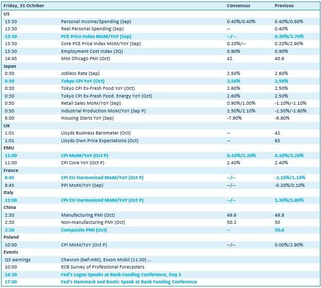 Ondanks een drukke week, met een pak economische data, bedrijfsresultaten en vergaderingen van centrale banken allerhande, is het vandaag nog even doorduwen tot het weekend. Data uit de VS krijgen we dan wel niet, maar inflatiecijfers zijn er wél bij de vleet uit zowat heel de wereld. Zo bijvoorbeeld uit Japan, waar ook inzicht gegeven wordt over de kleinhandelsverkoop, terwijl ook Europa, Frankrijk, Italië en Polen inflatiedata bekendmaken. Het VK pareert dat geweld met een update van de Lloyd's business barometer, terwijl China vannacht al met een update van de belangrijke PMI-index op de proppen kwam.