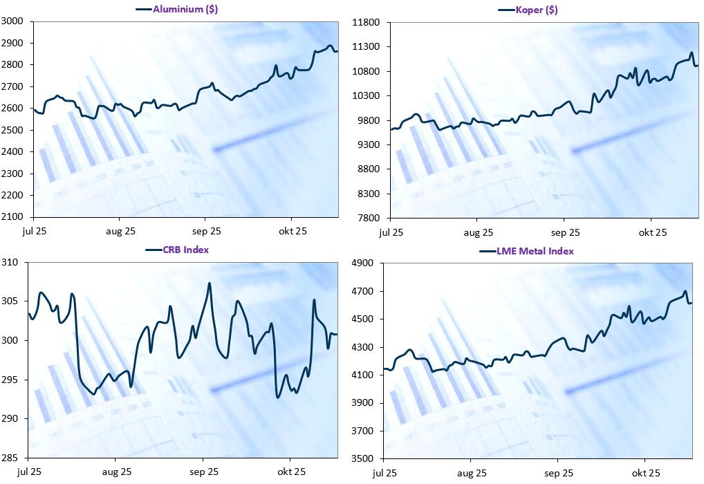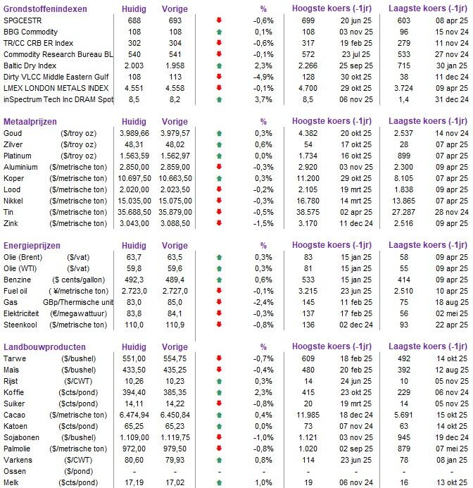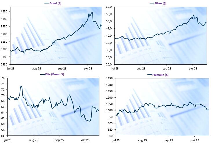 - De goudprijs verdapperde ietwat tot 4.002 dollar per ounce, terwijl cryptomunten stabiliseerden. Voor een Bitcoin telt u 103.191 dollar neer, terwijl de grondstoffenprijzen wat onder druk bleven staan. De olieprijzen stegen 0,3% na een verrassende voorraadopbouw eergisteren van 5,2 miljoen vaten door de EIA.