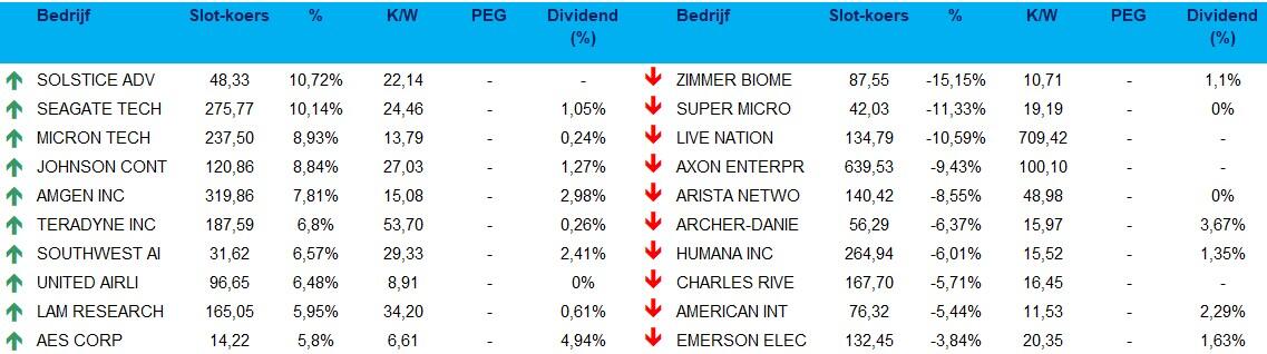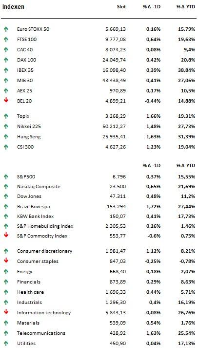 - En vrees was er ook in de VS niet, waar zowel de S&P500 (+0,4%) als de Nasdaq (+0,6%) de rug konden rechten, waarbij zowat alle sectoren in het groen afklokten. Aan beide kant van de Grote Plas kregen nutsbedrijven trouwens amper wat winst bij elkaar geharkt, dat zegt ook wat. Ook op de Aziatische markten is er weer plaats voor kalmte. China (+1,4%), Hongkong (+1,6%) en Japan (+1,3%) trekken er vannacht de kar, in een sessie die niet werd gesteund door nieuws van enigerlei waarde.