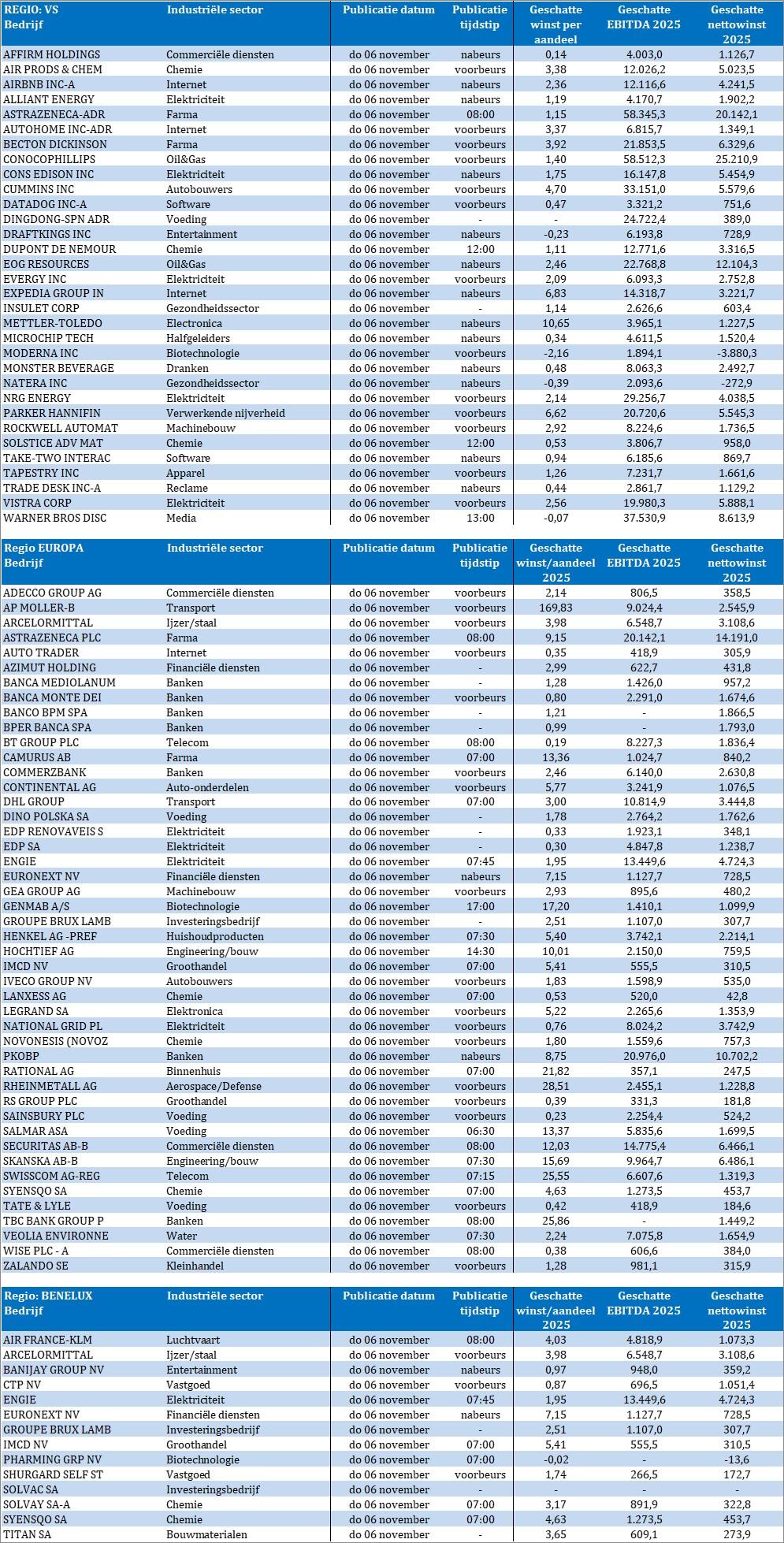 - Ook vandaag weer staan er massa’s bedrijfsresultaten op het menu. Zo bijvoorbeeld kijken we over de schouders van Affirm Holdings, Airbnb, Astrazeneca, Autohome, ConocoPhillips, Cummins, Datadog, DraftKings, DuPont de Nemours, Expedia, Insulet, Moderna, Monster Beverage, Parker Hannifin, Rockwell Automation, Trade Desk, Adecco, ArcelorMittal, Astrazeneca, BT, Commerzbank, Continental, DHL, EDP, Engie, Euronext, GBL, Henkel, Hochtief, IMCD, Iveco, Lanxess, Legrand, Rheinmetall, Syensqo, Tate & Lyle, Wise, Zalando, Air France-KLM, CTP, Pharming, Shurgard, Solvac, Solvay, Titan en veel meer van dat moois.