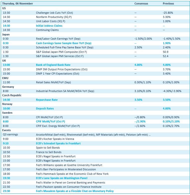- Op de economische kalender nemen de centrale banken een prominente plaats in. In het VK, Tsjechië en Noorwegen worden rentebesluiten verwacht, al lijkt het erop dat de rente overal ongewijzigd zal blijven. In Europa volgen we de kleinhandelsverkopen van september, die een indicatie geven van het consumentengedrag. Zweden publiceert zijn inflatiecijfers, wat belangrijk is voor het rentebeleid van de Riksbank. Tot slot spreekt Isabel Schnabel van de ECB deze week. Haar toespraak kan extra inzicht geven in het toekomstige monetaire beleid binnen de eurozone.