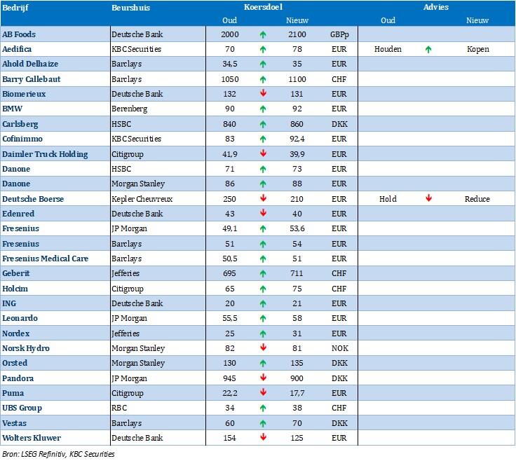 Aedifica: {{15954457, AEDIFICA SA, AED}} de Belgische zorgvastgoedgroep werd opgewaardeerd van “houden” naar “kopen” en toegevoegd aan de Bolero Benelux Selectie, vooruitlopend op goedkeuring van de mededingingsautoriteiten medio januari. Het aandeel heeft sinds de aankondiging van het vrijwillige overnamebod op Cofinimmo ondergepresteerd, maar verbeterde zichtbaarheid op de timing en verwachte indeximpact kunnen een koersherstel ondersteunen. Op fundamentele basis biedt het aandeel 22,4% opwaarts potentieel naar een faire waarde van 78 euro, gebaseerd op 14x forward EPRA EPS (pro forma inclusief synergieën van 16 miljoen euro en exclusief eenmalige kosten). KBCS verhoogt de aanbeveling van “houden” naar “kopen” en het koersdoel van 70 euro naar 78 euro.
