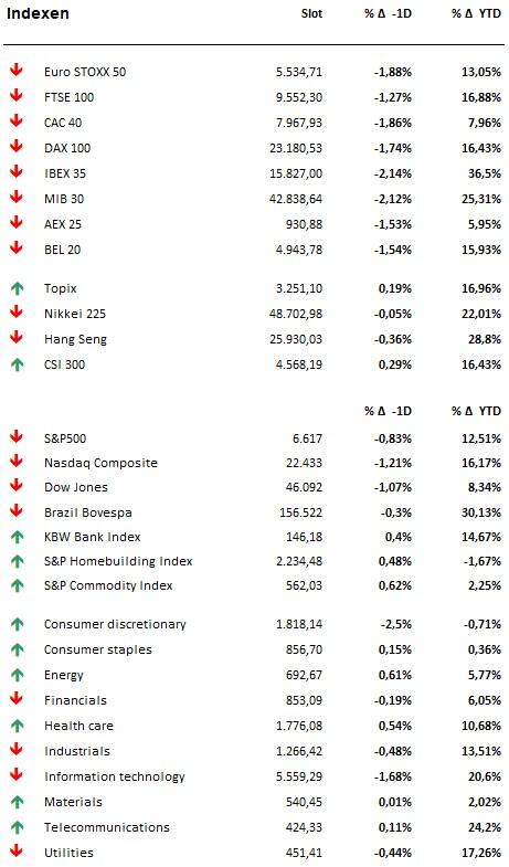 - Dat gezegd zijnde noteren we alweer een verliesdag op de Oosterse en Westerse beurzen. Nadat de S&P 500 maandag voor het eerst sinds 30 april 2025 onder zijn 50-daags voortschrijdend gemiddelde afsloot, een belangrijke tussentijdse trendindicator, ging er gisteren nog eens 0,8% van de teller af. Dat zet de index op 6% verlies sinds de topkoersen van oktober, nog steeds 12,5% boven de slotkoers van 2024. Techbeurs Nasdaq verloor gisteren 1,2% van zijn waarde, en houdt zo nog 16,2% winst over in 2024.