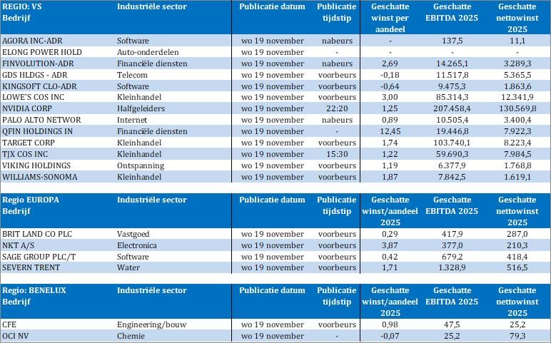 - Qua bedrijfsresultaten kijken we natuurlijk met een heel veel belangstelling uit naar de kwartaalupdate van AI-goeroe Nvidia. En dat wachten wordt opgeleukt met onder meer Agora, British Land, CFE, Elong Power Hold, Finvolution, GDS Holdings, Kingsoft Cloud, Lowe's, NKT, OCI, Palo Alto Networks, QFIN Holdings, Sage Group, Severn Trent, Target, TJX, Viking Holdings en Williams Sonoma.