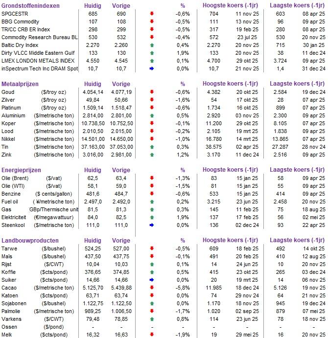 - Maar fysiek goud hield wél stand (-0,4% tot $4.059/ounce), bij een stabiele dollar (€1 = $1,1538). Ook de obligaties boden onderdak, want de 10-jaarsrente in de VS bleef onbewogen op 4,1%, tegenover een eveneens stabiele 2,71% in Duitsland. En ook de olieprijs hield best goed stand, ondanks een daling met 0,5% naar 71,50 dollar per vat. Er wordt dan ook gefluisterd dat er extra OPEC+ productiebeperkingen aan zitten te komen.