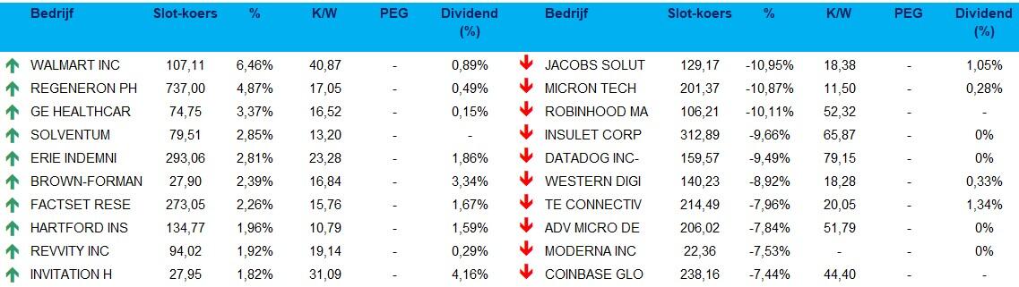 Walmart {{291252, WALMART INC., WMT}}: de retailer verhoogde voor de tweede keer dit jaar zijn jaarlijkse vooruitzichten na een sterk kwartaal met 28% groei in online verkoop. Het bedrijf verwacht nu een omzetgroei van 4,8% tot 5,1% en een aangepaste winst per aandeel tussen 2,58 en 2,63 dollar, tegenover een eerdere prognose van 2,52 tot 2,62 dollar, terwijl de gemiddelde analistenverwachting op 2,56 dollar lag. De kwartaalomzet steeg met 5,8% tot 179,5 miljard dollar en de winst per aandeel kwam uit op 0,62 dollar, 0,02 dollar boven de verwachtingen. Walmart verhuist zijn beursnotering naar Nasdaq en benadrukt zijn technologie- en AI-gedreven strategie, terwijl internationale verkoop met 10,8% toenam.