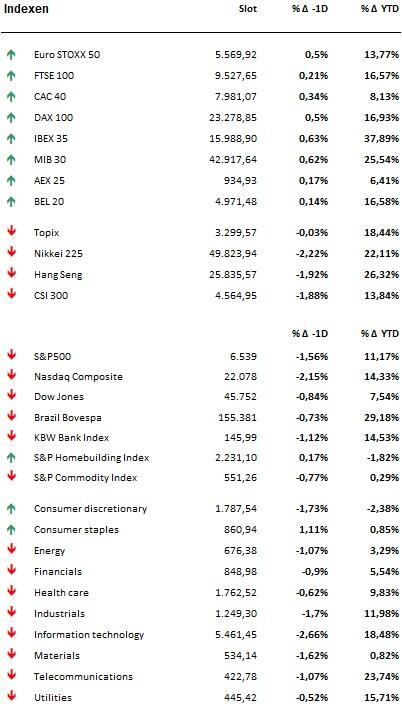 - De financiële markten in Europa en de VS herstelden in het zog van hernieuwd AI-optimisme, en leken zo komaf te maken met de correctietrend van de voorgaande dagen. Er overheerste in eerste instantie dus opnieuw (voorzichtig) optimisme en een vorm van risicobereidheid in sommige recent geplaagde sectoren zoals technologie. Maar in ‘Geen Lid ‘ van De Nieuwe Snaar klonk het ooit : “zo snel als het gekomen was, zo ging het ooit weer weg”.