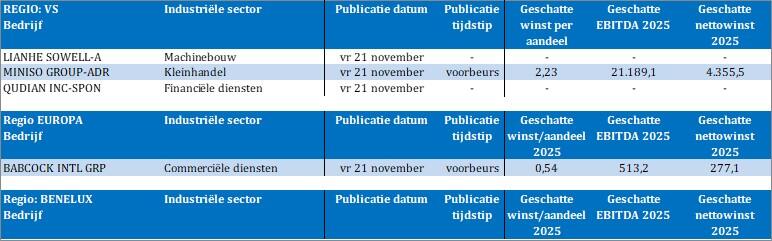 - Wat er vandaag mag worden verwacht is duidelijk: onzekerheid, met misschien een lichte vorm van paniek en zeker een duidelijk aanwezige baslijn van ongemakkelijkheid. Volatiliteit is niet iets dat we gewoon zijn geraakt in 2025, dus het zal even duren vooraleer beleggers weer op het gemak zijn. Maar er zijn zekerheden: bedrijven hebben er een heel sterk derde kwartaal opzitten voor wat betreft winstcijfers, de groeicijfers zijn wereldwijd niet hoog, maar wel stabiel, en grote delen van de beurswereld gingen de voorbije 12 tot 24 maanden niet mee in de Amerikaanse AI-hausse.
