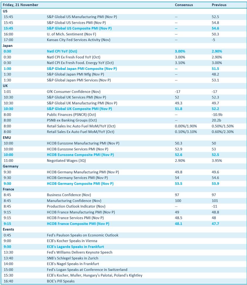 - Vandaag staan er belangrijke PMI-sentimentsdata op het menu en die komen van zowat overal ter wereld: de VS, het VK, Japan, Duitsland, Frankrijk, de Eurozone. Verder krijgen we uit de VS en het VK een update van het consumentenvertrouwen, terwijl Japan inzicht geeft in de inflatiecijfers. Het VK brengt verder nog wat inzicht in de detailhandelsverkopen aan, terwijl Frankrijk een rist vertrouwensindicatoren vrijgeeft. Tot slot spreken centrale bankiers van de Fed, ECB, SNB en BOE op diverse evenementen.
