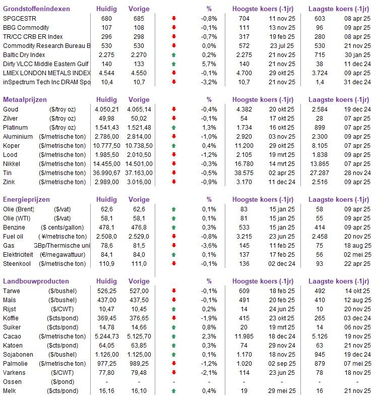 - Ondertussen viel de Europese gasprijs terug tot 30 euro/MWh, het laagste niveau sinds mei 2024. Die daling volgt op signalen van vredesoverleg tussen Oekraïne, VS en Rusland, wat hoop geeft op versoepeling van sancties en meer Russische energie op de markt. Daarnaast temperen milde weersvoorspellingen voor eind november en begin december de vraag, al daalden de voorraadniveaus tijdens de huidige koudegolf tot onder 81%, tegenover circa 90% een jaar geleden.