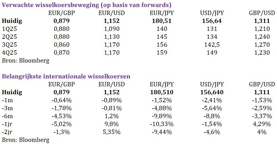 - Op de obligatiemarkten is er al weken geen paniek, en dat veranderde ook vrijdag niet. De 10-jaarsrentes in de VS en Duitsland noteren op 4,06% en 2,69%, respectievelijk 3 en 2 basispunten lager dan vorige week donderdag. De Amerikaanse dollar blijft zijn rol als veilige haven vervullen. De greenback noteert op 1.1516 dollar tegenover de euro, wat wel nog altijd 11,2% lager is dan in het begin van 2025. De belangrijkste focus in de valutamarkt lag echter opnieuw op de yen, want de Japanse munt daalde alweer (-0,1%, $1 = JPY 156,63) tot het laagste peil in 10 maanden).