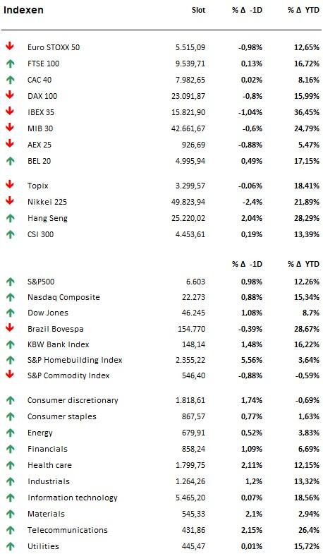 - We gingen de week uit met winst op Wall Street (+1%), waarmee de Amerikanen de wat meer sceptische Europeanen het nakijken gaven. De Euro Stoxx 600 klokte vrijdag namelijk 0,3% lager ad, ondanks 0,49% winst tot 4.995.94 punten voor de BEL20 (zullen we vandaag opnieuw de kaap van de 5.000 punten slopen?) en 0,02% voor de Franse CAC40. Azië volgt vannacht de marsrichting van Wall Street (+1% op het slot), zij het met bescheiden winst. Enkel Hongkong (+2%) trekt hard van leer, Taiwan (+0,3%), Vietnam (+0,8%) en India (+0,1%) doen het beter dan en Zuid-Korea (-0,2%). Japan hield de deuren dicht voor Labor Thanksgiving Day