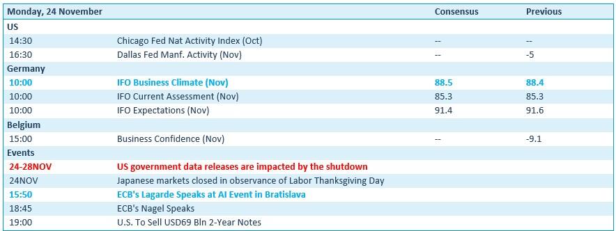 - Centraal in de handel staat een hernieuwde kalmte voor wat betreft het AI-thema (misschien zit er dan toch waarde in AI en zijn de huidige waarderingen misschien toch niet zo exuberant?) en het rentescenario (een Amerikaanse renteverlaging in december zou dan toch steek houden volgens Fed-directeur Williams, ondanks de ‘datahongerige’ beleidsmakers het zelf al lang niet meer weten). En dan zijn er nog de geopolitieke ontwikkelingen, nu de VS en Oekraïne aan een plan timmeren om de oorlog met Rusland te beëindigen, na een akkoord over de aanpassing van een eerder voorstel dat té gunstig was voor Moskou (maar is dat niet zo voor elk plan dat daar op tafel gelegd zal worden?)