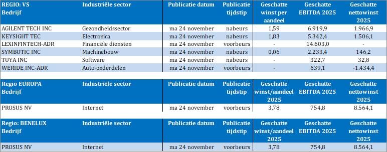 - Bedrijfsresultaten komen er vandaag van Agilent Technologies, Keysight Technologies, LexinFintech, Prosus, Symbotic, Tuya, WeRide.